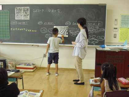 1年生の算数の授業の様子です。「10より大きなかず」の学習をしているところです。教科書にはたくさんの数の物や虫を描いたイラストがあります。2つずつ、または5つずつ鉛筆で囲みながら数えます。自分の考えを進んで発表しています。