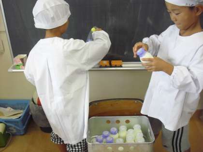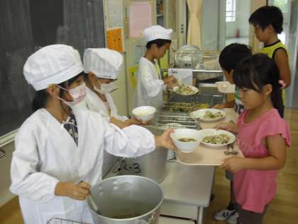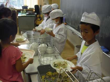 2年生の給食配膳の様子です。今日から給食が始まりました。給食当番が、手際よくご飯やスープを食器に入れて配っています。しゃもじやお玉の使い方も慣れたものです。クラスの友達は静かに待っています。落ち着いていて安心して見ていられます。