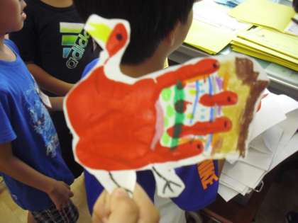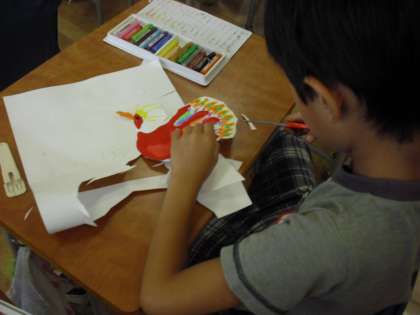 1年生の図画工作の授業の様子です。鳥の形をよく見ると、手形を上手に生かして鳥を描いています。親指の先が頭、人差し指から小指までを羽に見立てています。描いた絵を上手に切り抜く1年生。用具の使い方も慣れたものです。