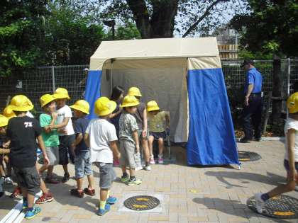 1年生が仮設トイレを見学しているところです。中学生が仮設トイレを組み立てている様子も見学しています。マンホールの中をのぞいたり、できあがった仮設トイレを見て「本当にトイレみたい」と驚いていたり、学校の秘密を知ったようです。