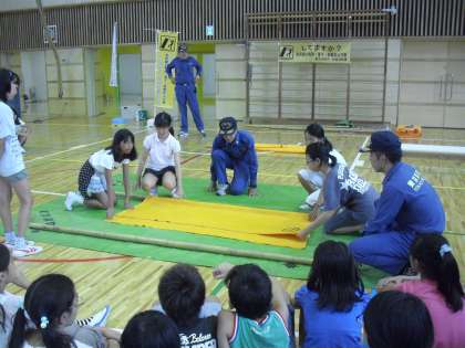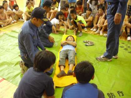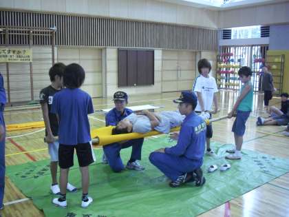 5・6年生の救護訓練の様子です。負傷した人を簡易担架で運ぶ体験です。木の棒と毛布を使って簡易担架を作ります。担架にのせる人を落とさないように、しっかりと持ち上げます。身近にある物でも災害時に役立つことを知ることができました。