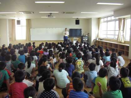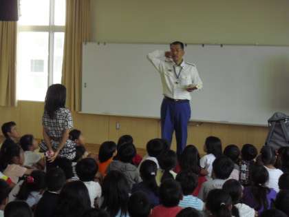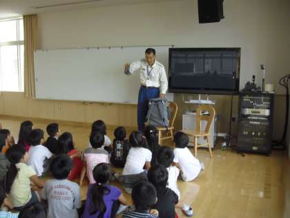 多目的室で行った防災講話の様子です。低・中・高学年別に全学年がお話を聞きました。様々な防災グッズを紹介してくださいました。「日常から防災への意識を持つことが大切です」と子どもたちに教えてくれました。防災についてのいろいろな体験をしたり、お話を聞いたりすることを通して、防災への理解を深めることができました。