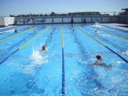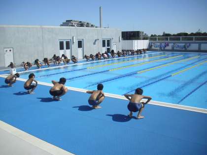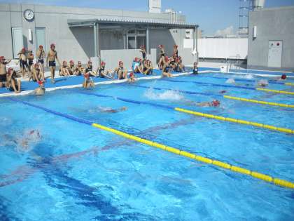 準備運動を行い、シャワーを浴びたあと、水慣れで一人25mを2本泳ぎます。心と体をほぐして記録会に臨みます。