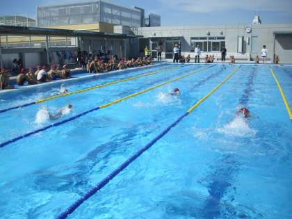 女子50m自由形の様子です。レース毎に名前を呼ばれ、大きな声で返事をします。スタートと同時に友達を応援する声が響きわたります。記録・計時は教員が責任を持って行います。