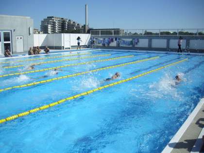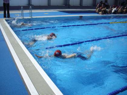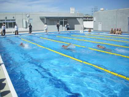 男子50m自由形です。力いっぱい泳ぐ様子が水しぶきから伝わってきます。ターンをして再び勢いをつけゴールを目指します。
