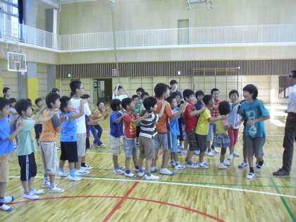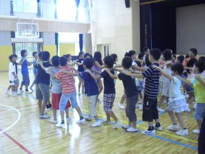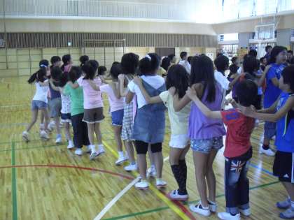 縦割り遊び「フレンド・ワールド」の様子です。2年生と5年生が仲良く遊んでいるところです。5年生が遊びを企画しています。小学校の体育館を使っていたクラスは、「ジャンケン・ジェンカ」で楽しんでいました。異学年とのふれあいも大切にしています。