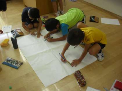 3年生の総合的な学習の時間の授業の様子です。子どもまつりに向け、それぞれのお店の準備をしているところです。お店を作る人、小物を作る人、看板を作る人等、役割を分担し、進めています。