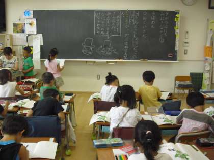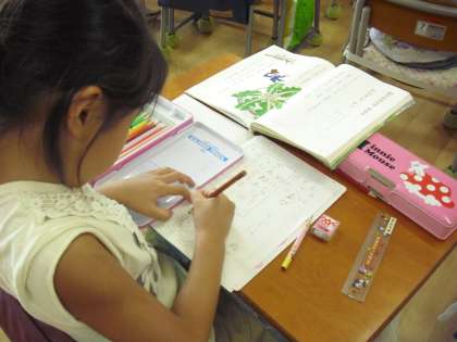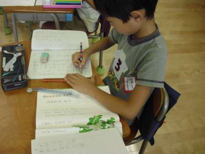 1年生の国語の授業の様子です。「大きなかぶ」の学習をしているところです。大きなかぶを引きぬこうとしたおじいさんですが、引きぬくことができません。そのときのおじいさんの気持ちを想像してノートに書いているところです。いろいろなことができるようになってきました。
