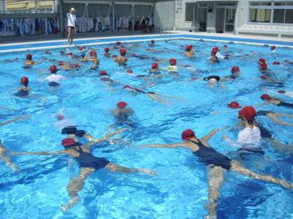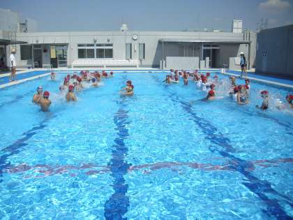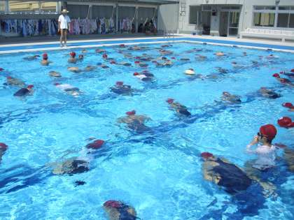 4年生の体育の授業の様子です。プールでの学習も今週いっぱいです。今日もプール日和となりました。水慣れをしているところです。いろいろな動きで水に浮きます。だるまさん、大の字、マッチ棒、スーパーマン、アンパンマン・・・長い時間水に浮くことができる子どもが増えました。