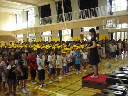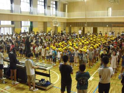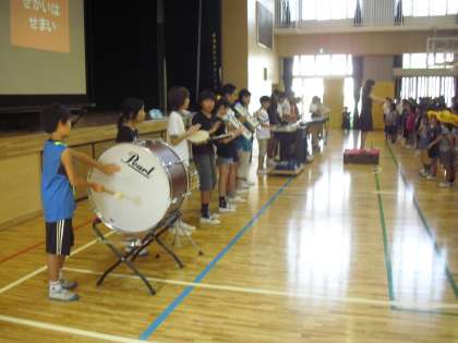 続いて全員での合唱です。明るい歌声が体育館に響きます。2部合唱に入るタイミングも上手にできました。最後に、器楽委員会の演奏に合わせて1番・2番を通して歌いました。全員が合唱の楽しさを味わうことができました。