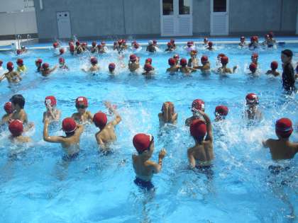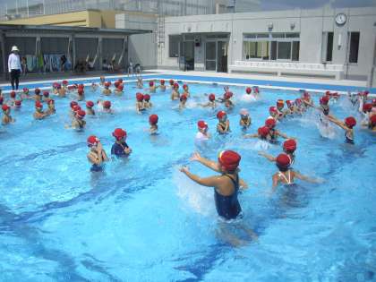 1年生の体育の授業の様子です。最後のプールを楽しんでいます。水かけっこや水中ジャンケンをしています。水遊びを通して、水と仲良しになれた1年生。浮いたり、もぐったり、水中で目を開けたりと、いろいろなことができるようになりました。