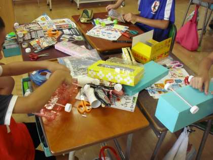 3年生の図画工作の授業の様子です。「動く車」の制作に取り組んでいるところです。牛乳カップや紙コップ、ストロー、キャップ、竹ひご等を使って動く車を作ります。車のデザインにも工夫が見られます。子どもたちの創造力が広がります。