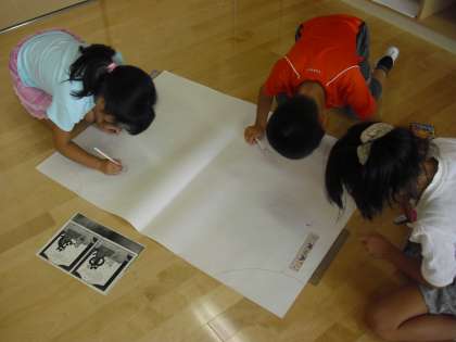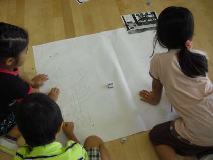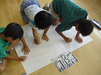 2年生の生活科の授業の様子です。保育園や芦花ホームの方々との交流の際に行っている読み聞かせに使う大型絵本の作成に取りかかったところです。場面ごとにグループで担当し、下絵を描いています。中学生との交流でも活用する予定です。