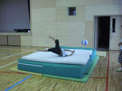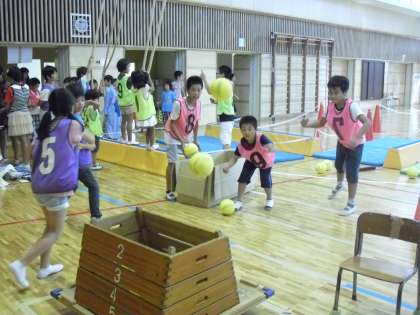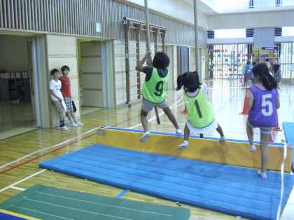 体育館のお店の様子です。5年生の「サスケでタイム」は、登り綱で飛び移ったり、ボールを跳び箱の中に投げ入れたりするタイムを競うお店です。6年生の「くらいつけ!ジャンピングキャッチ」は文字通り、上から落下してきたボールをキャッチします。全力でダッシュです。