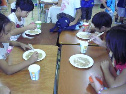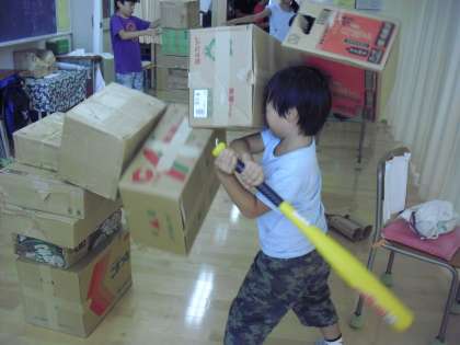 6年生の「ジミー2」で針の糸通しや大豆つかみをしているところです。低学年が一生懸命に挑戦していました。「イライラ飛んでけ!ストレス発散」で積み上げたダンボールをバットでひと振り!スカッとしました。