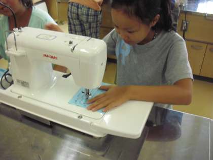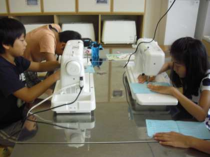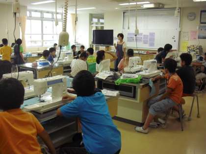 5年生の家庭科の授業の様子です。初めて使うミシンの操作について学習しているところです。部分の名前や機能、安全な扱い方について学びました。練習用の布を使って実践します。真っ直ぐに縫うことができるように布をしっかりおさえて行いました。