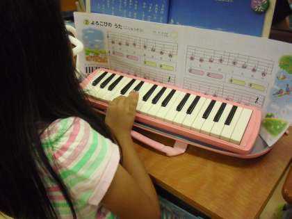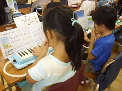1年生の音楽の授業の様子です。鍵盤ハーモニカで「よろこびのうた」の演奏をしているところです。指づかいに気をつけながら吹きます。演奏できる曲がふえる度に、音を奏でるのが楽しくなります。