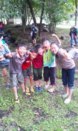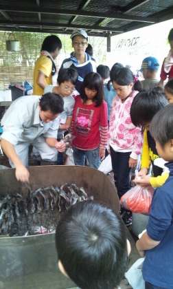 長い時間、ますを追い込んで、ます取りに成功して喜んでいるチームのメンバーです。