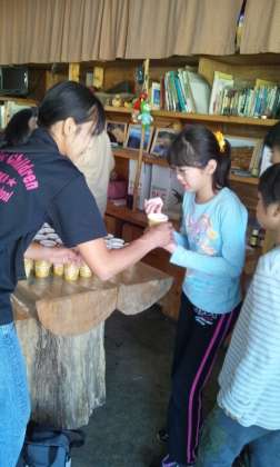 関さんのりんご園に到着しました。りんごを1人2切れとりんごジュースをいただきました。りんごは皮まで柔らかく、ジュースは甘い蜜の味です。
