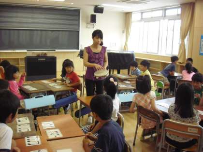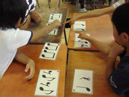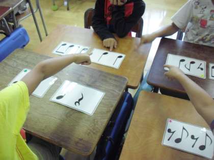 2年生の音楽の授業の様子です。グループ毎に7枚の異なったリズムの音符がかいてあるカードを配り、音楽専科がたたくリズムのカードを探します。「これだ!」と思ったら指で示します。リズム譜を見て演奏する力も身に付けていきます。
