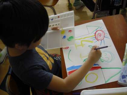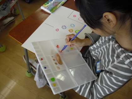 1年生の図画工作の授業の様子です。画用紙をシャツに見立てて、模様を描いています。パレットや筆の使い方も上手になりました。水を使いながら色を薄めるなど扱い方にも成長を感じます。