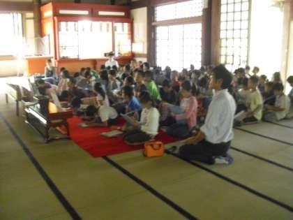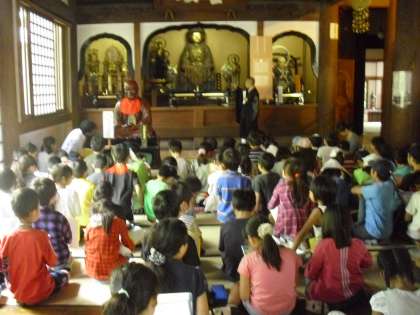 神秘的な阿弥陀如来像を前に、子どもたちも正座をして話を聞きます。大きな仏像を見上げながら、浄土の教えを行事にした、三年ごとに行われる「おめんかぶり」の話を聞きました。