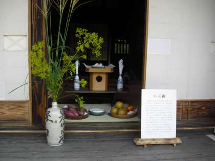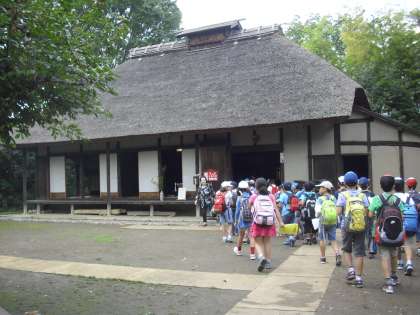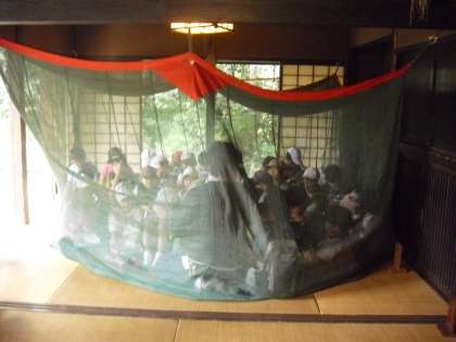 次大夫堀公園の様子です。古い民家で昔の人々くらしについて学びました。蚊帳に入って指導員の方から説明を聞きます。昔の人が使った道具に触れたり、何に使ったのかみんなで考えたりしながら生活の知恵について学びました。