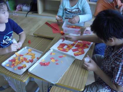 ひかり学級の作業の様子です。連合運動会に向けて表示を作成しているところです。ちぎった色画用紙をのりでていねいに張り付け、文字にしていきます。何文字もあるのでみんなで協力して作業を進めています。