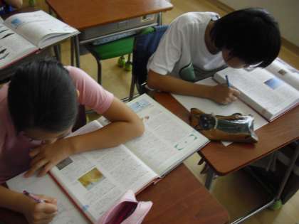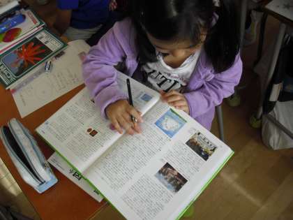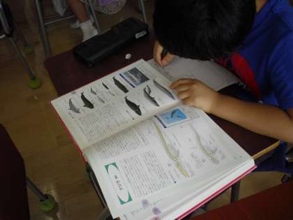 4年生の国語の授業の様子です。「百科事典で調べよう」の学習をしているところです。自分が調べたいテーマについて、百科事典を使って調べます。文章を丸写しするのではなく、必要な情報を取り出してまとめるように指導しています。