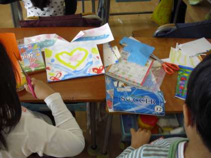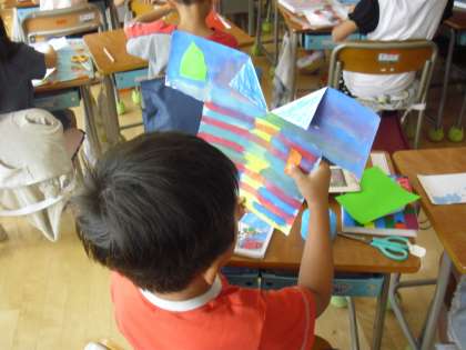 1年生の図画工作の授業の様子です。画用紙をシャツに見立てて、オリジナル模様のシャツを描いています。折り紙を使って飾りを付ける工夫をしている人もいます。自分のシャツを手に満足そうです。
