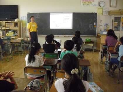 4年生の社会の授業の様子です。「くらしのうつりかわり」の学習をしているところです。昔(昭和初期)の一般的な家庭の茶の間のスライドを見て、写っている物などから現在との違いやつながりを考えています。