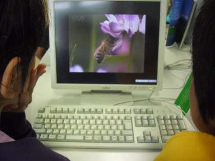 5年生の理科の授業の様子です。「実や種子のできかた」の学習をしているところです。映像の資料を活用して、花粉ができ、花粉が運ばれ、実ができるまでを学んでいます。新しい校庭の学級園で、実物を通して観察するのが楽しみです。