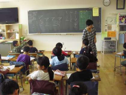 1年生の国語の授業の様子です。カタカナを学習しているところです。担任から、気をつけて書くところなどを教えてもらい、みんなで筆順を確認して、ノートに練習をしています。丁寧に取り組みます。
