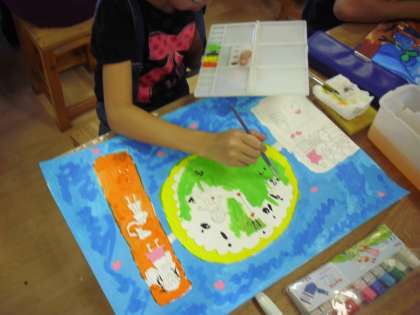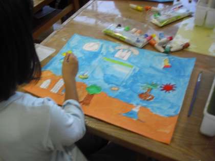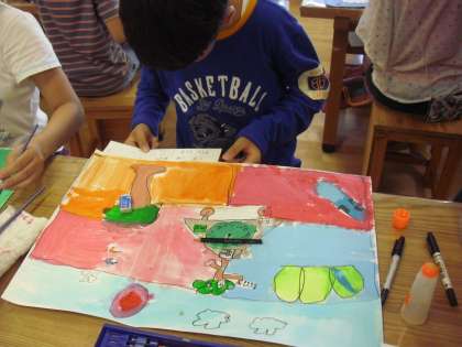 4年生の図画工作の授業の様子です。「まほうの時計」も完成に近づいてきました。丁寧に仕上げを行っているところです。画用紙いっぱいに広がるお話の世界。完成後は、お話をカードに書きます。