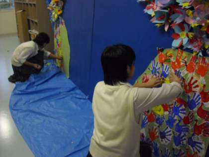 50周年記念式典に向けての装飾の制作の様子です。小学生が作った飾りを有志の中学生が貼り付けているところです。連日、放課後に、小学校の図工室で作業をしてくれています。手際もよく楽しんで仕事をしてくれています。