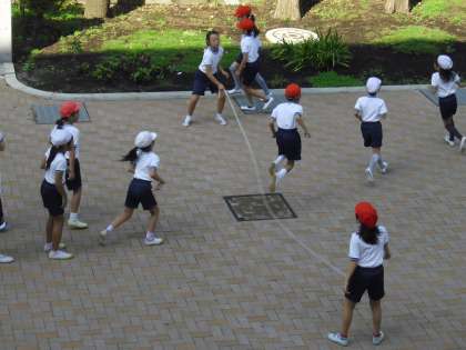 4年生の体育の授業の様子です。晴れた日は外で気持ちよく体を動かします。北門前のスペースを利用して長なわ跳びをしているところです。調子よくリズミカルに跳んでいます。クラス記録の更新を目指します。