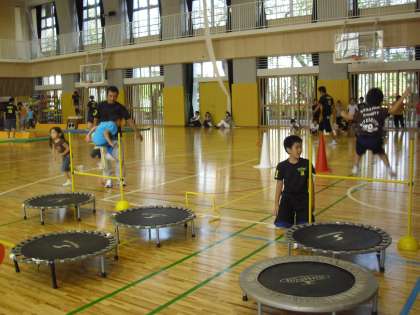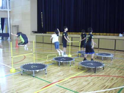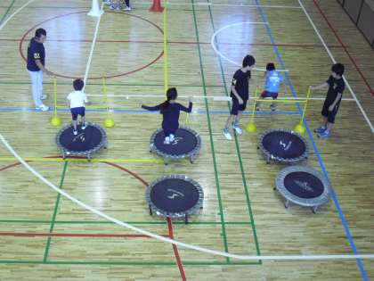 トランポリンを使った運動の場です。空中での自分の動きを操作する運動です。空中動作に対するバランス感覚を必要とします。子どもたちにとっては、空中に体が浮くことが楽しい運動です。