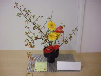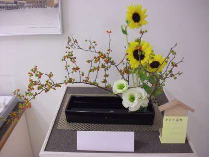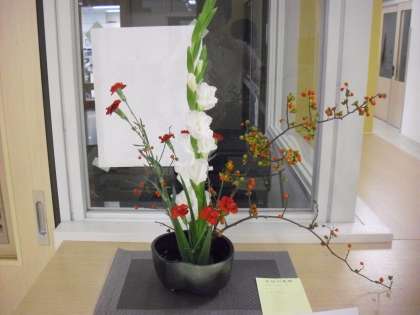 中学校の生け花部の作品です。一番上の作品は、小学校の事務室前の作品です。花材はつるうめもどき、ガーベラ、アンセリュウムです。次は、小学校側職員室前の作品です。花材は、つるうめもどき、カーネーション、グラジオラスです。最後は、中学校昇降口前の作品です。花材は、ヒマワリ、トルコキキョウ、つるうめもどきです。いつもやすらぎを与えてくれます。