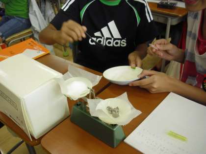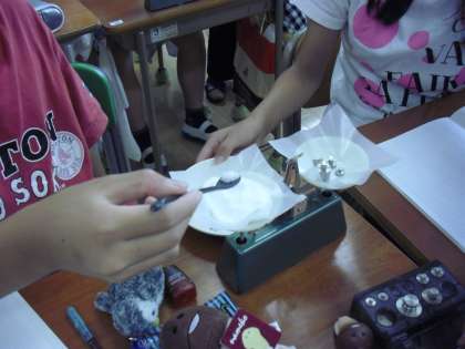 6年生の理科の授業の様子です。上ざらてんびんを使って、食塩の重さを量っているところです。分銅の重さと同じ重さになるように、さじを使って重さを調節しています。均等になるように慎重に量っています。