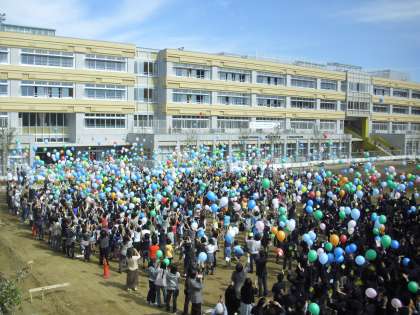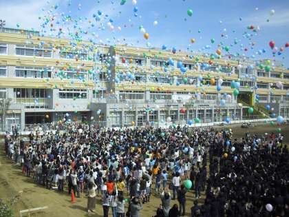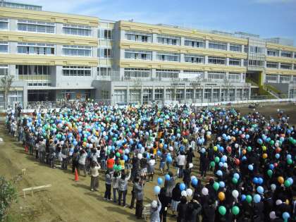 全員に風船が行きわたり、いよいよカウントダウンです。渡部校長、野口校長のマイクの声に合わせて、子どもたちも大きな声でカウントダウンをしました。「20、19……3、2、1、0!」子どもたちのメッセージを付けた風船が、青空に吸い込まれるように飛んでいきました。