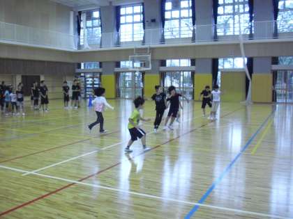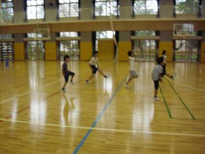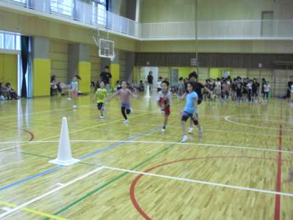 スポーツ教室の様子です。サイドステップや足を高く上げてのステップなど、様々な動きに取り組んでいます。小学校期は、神経系の発達が著しく、多様な動きに親しむことで成長を促します。