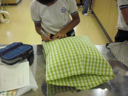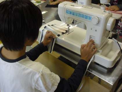 6年生の家庭科の授業の様子です。生活に役立つものの製作に取り組んでいるところです。同じ物を作るのではなく、これまで学習して身に付けたことを生かして、一人一人が考えたものを作っています。