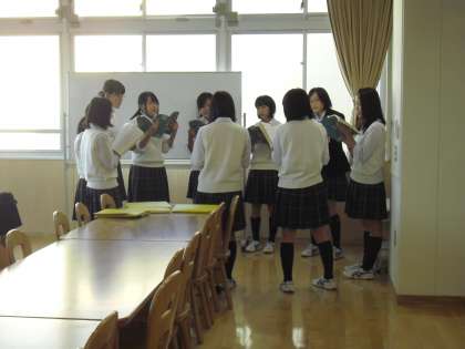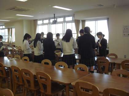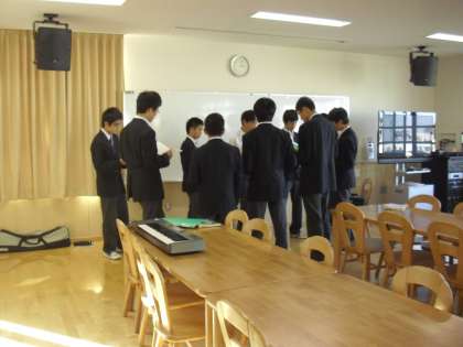 多目的室で中学生がパート毎に分かれて、合唱の練習をしている様子です。学芸発表会に向けて、各クラスが小中学校の施設を活用して練習に取り組みます。クラス全員で力を合わせてつくり上げていきます。