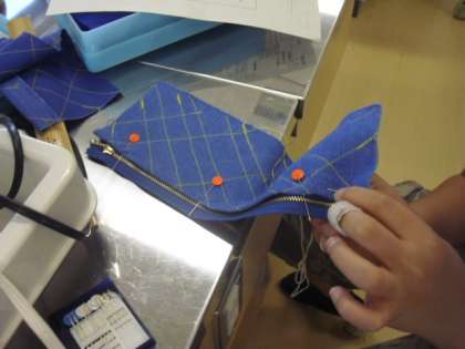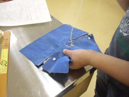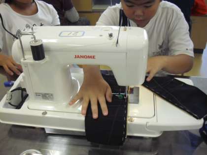 5年生の家庭科の授業の様子です。小物入れの製作に取り組んでいるところです。自分の好きな色の生地を選び、学習したミシンの使い方、手縫いの手法をもとにして、丁寧に作っています。