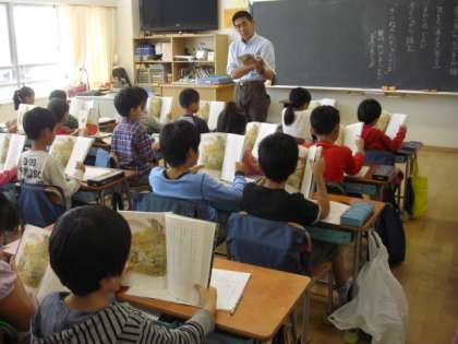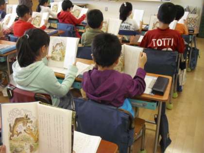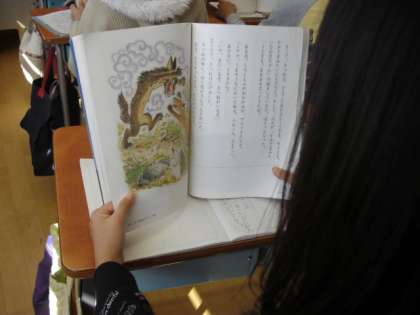 2年生の国語の授業の様子です。「きつねのおきゃくさま」の学習に取り組んでいるところです。お話のあらすじをつかむために、担任の範読を聞いています。教科書をしっかり持って、背筋が伸びたよい姿勢で聞いていました。