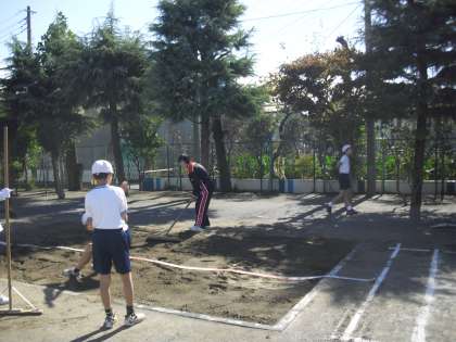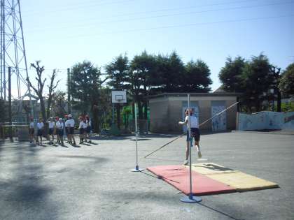地面を蹴っての走り高跳びも練習しました。体育館のフロアで行う感覚とは異なります。砂場を使っての走り幅跳びも練習しました。校庭が使用できない状況のなか、与えられた時間を有効に活用しました。子どもたちが、多くの方に支えられていることを実感します。