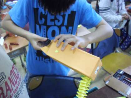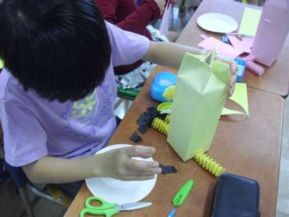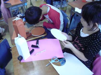 2年生の図画工作の授業の様子です。牛乳パックを活用し、動物の制作に取り組んでいるところです。手足の部分をジャバラにしたり、色画用紙を巻き付けたりして作成しています。作る動物によって使う材料も工夫して変えていきます。