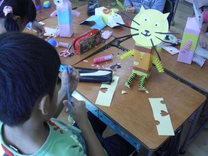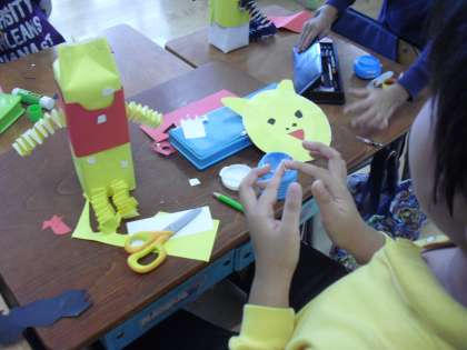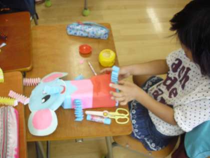 2年生の図画工作の授業の様子です。紙皿や紙コップなどを使って動物の表情を作っているところです。表情ができると動物も生き生きとしてきます。子どもたちの創作力が光ります。