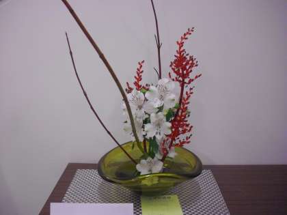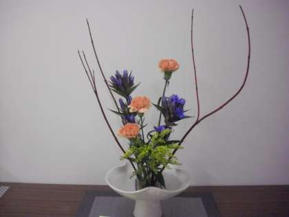 中学校生け花部の作品です。中学校側西昇降口に飾られています。上の作品の花材は、サンゴミズキ、リンドウ、カーネーション、ソリダコです。下の作品の花材は、アルストロメリア、サンゴアナナス、サンゴミズキです。気持ちが落ち着きます。