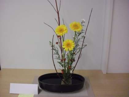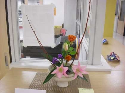 上の作品は、小学校保健室前の作品です。花材は、サンゴミズキ、ローズヒップ、クジャクソウ、ガーベラです。下の作品は小学校側職員室前の作品です。花材は、ユリ、ケイトウ、スターチズ、サンゴミズキです。生け花のある風景も定着してきました。